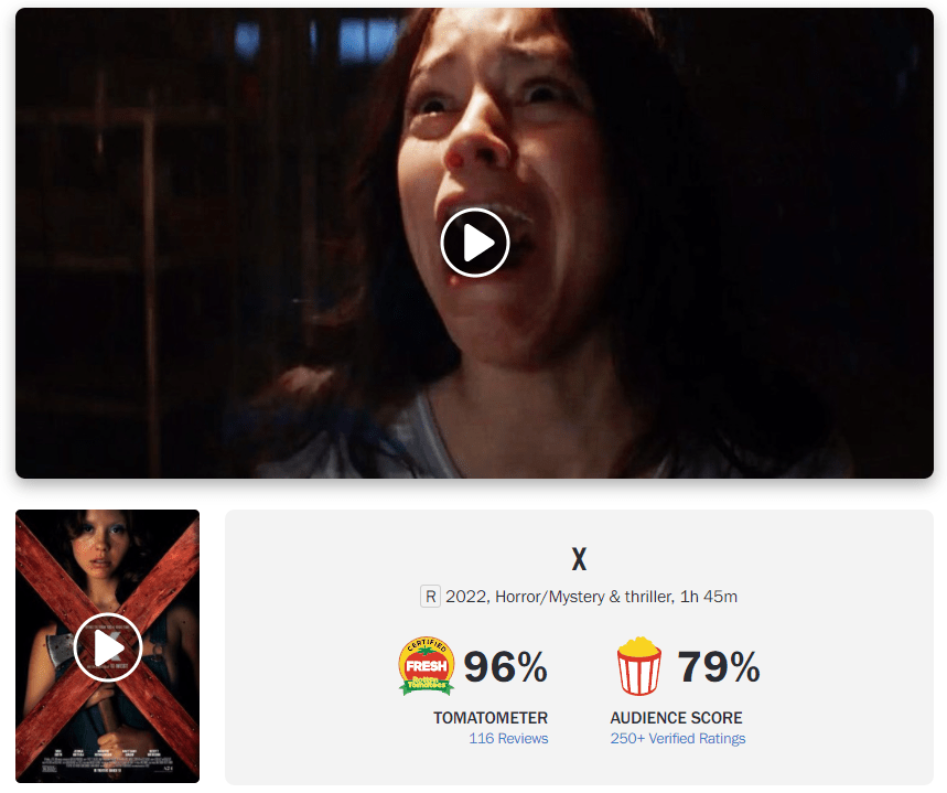 O novo terror slasher da A24, “X”, dirigido por Ti West e estrelado por Jenna Ortega, Mia Goth, Martin Henderson, Brittany Snow e Kid Cudi vem sendo bastante aclamado pela crítica especializada. No Rotten Tomatoes o filme mantém a incrível nota de 96% de aprovação com 116 críticas lançadas por diversos portais até o momento.