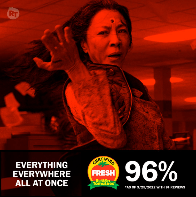O último lançamento da A24 em 2022, “Everything Everywhere All at Once”, dirigido por Daniel Kwan e Daniel Scheinert recebeu o certificado fresh do site Rotten Tomatoes! Com 74 críticas e 96% de aprovação, o filme conta a história de uma mulher que precisa salvar o multiverso.